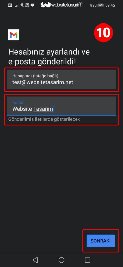 ● 10. resimde birinci kırmızı kutu içerisindeki “Hesap adı (isteğe bağlı)” alanını boş bırakabilir veya mail adresiniz yazabilirsiniz.
