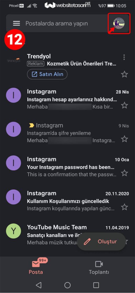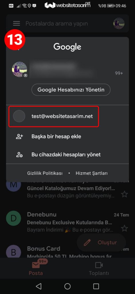 ● 13. resimde kırmızı kutu içerisinde işaretlenmiş alana eklemiş olduğumuz mail adresinin geldiğini görüyoruz ve tıklayıp mailimize geçiş yapıyoruz.
