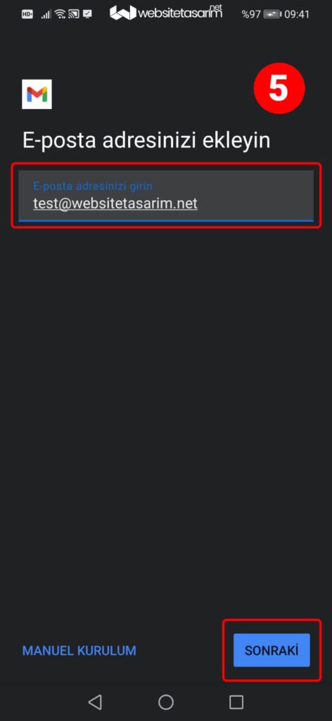 ● 5. resimde kırmızı kutu içerisindeki alana “e-mail adresimizi” yazıyoruz ve sonraki butonuna tıklıyoruz.