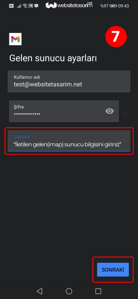 ● 7. resimde kırmızı kutu içerisindeki Gelen sunucu(imap) alanına “size ilettiğimiz sunucu bilgisini” yazıyoruz ve sonraki butonuna tıklıyoruz.