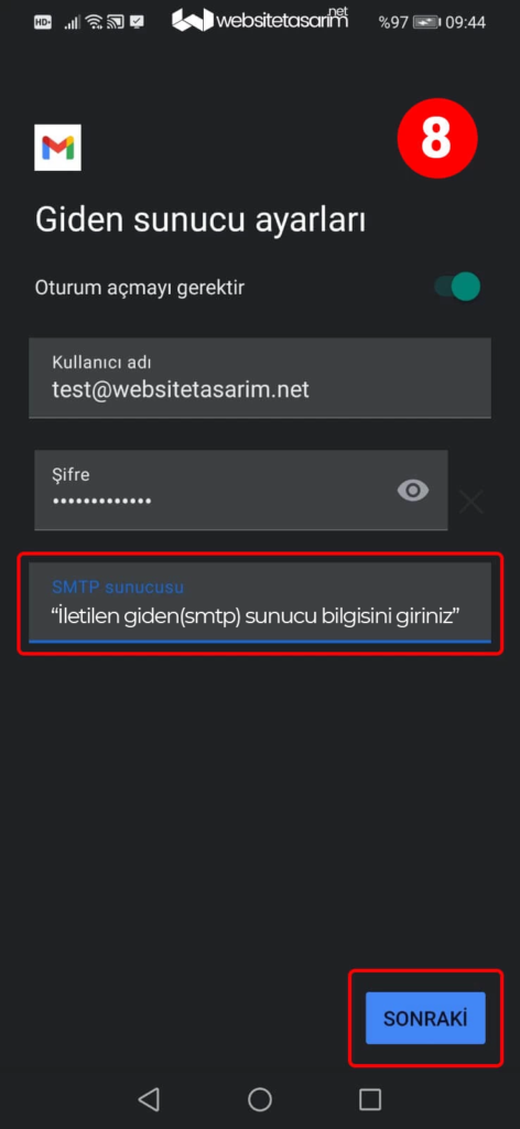 ● 8. resimde kırmızı kutu içerisindeki Giden sunucusu(smtp) alanına “size ilettiğimiz sunucu bilgisini” yazıyoruz ve sonraki butonuna tıklıyoruz.