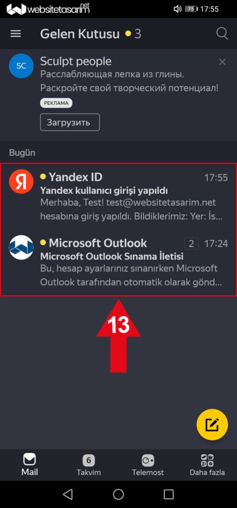 ● Ok içerisinde “13” ile göstermiş olduğumuz alana mailleriniz gelmeye başlayacaktır.