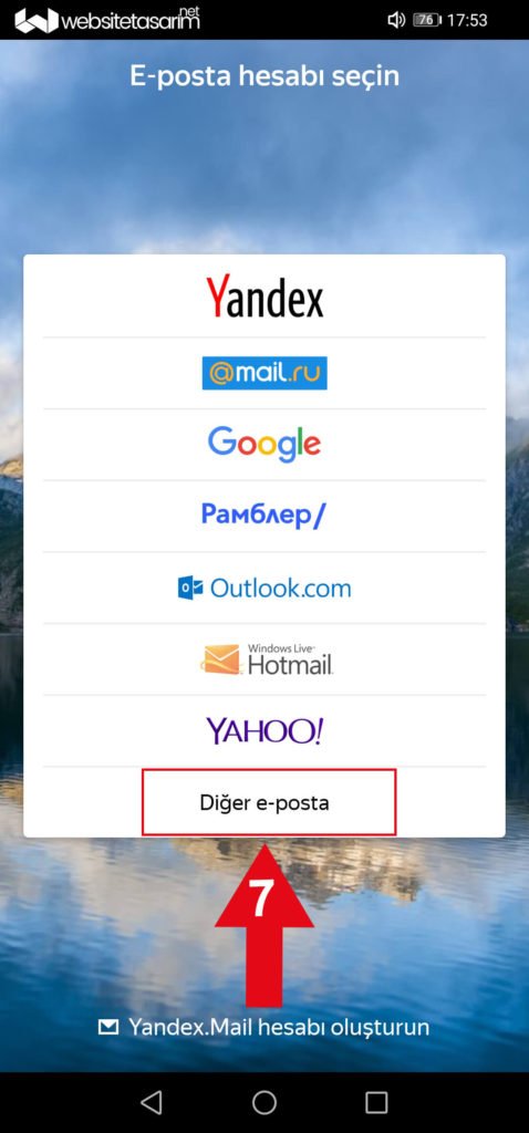 ● Açılan uygulamamızdan mail kurulumu için ok içerisinde “7” ile göstermiş olduğumuz alandaki “Diğer e-posta” seçeneğine tıklıyoruz.