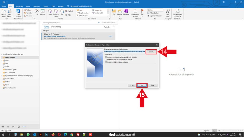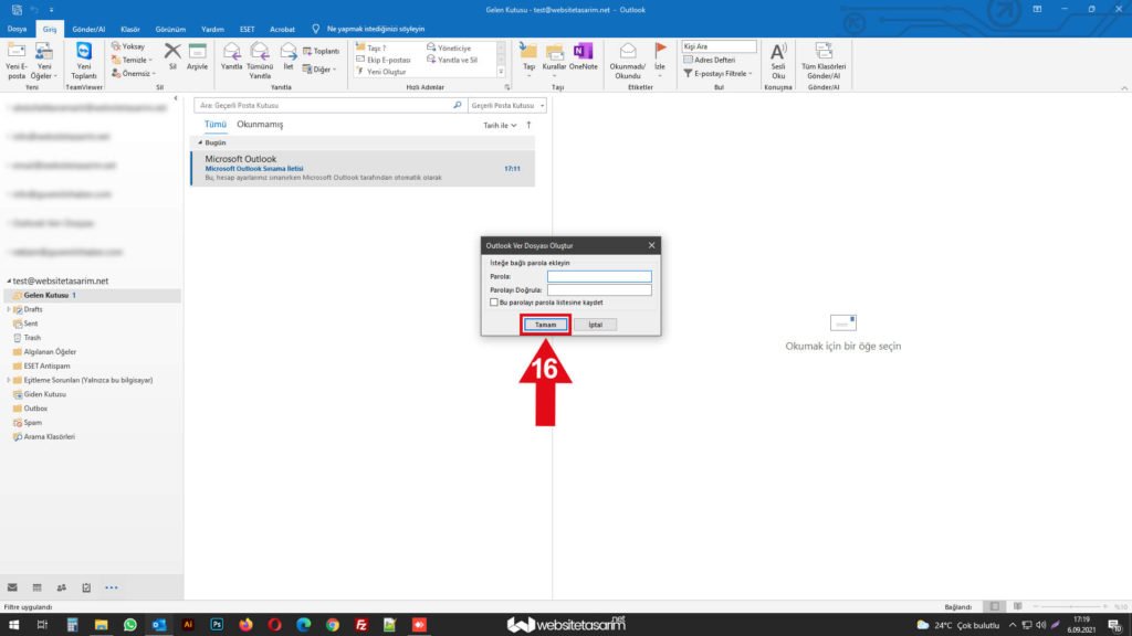 ● Karşımıza gelen bu pencerede herhangi bir işlem yapmadan ok içerisinde “16” ile göstermiş olduğumuz alandaki “Tamam” butonuna tıklıyoruz. Eğer buradaki ekranda şifre koyarsanız yedeği geri yüklerken sizden bu şifreleri outlook girmenizi isteyecektir. Bilgisayarınızın güvenli olmadığını düşünüyorsanız şifre koyabilirsiniz. Biz anlatımımızda şifre koyma işlemini tercih etmedik.
