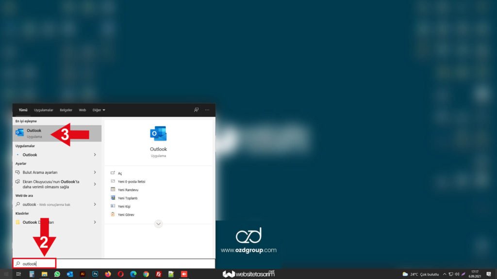 ● Ok içerisinde “2” ile gösterilen alana “outlook” yazıyoruz.