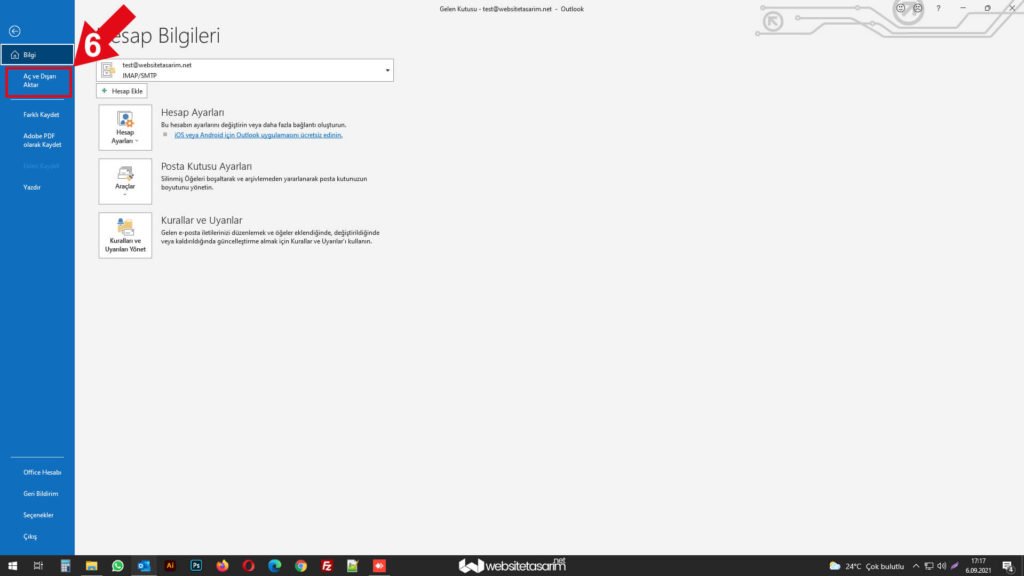 ● Açılan hesap bilgileri penceresinde ok içerisinde “6” ile göstermiş olduğumuz alandaki “Aç ve Dışarı Aktar” ibaresine tıklıyoruz.