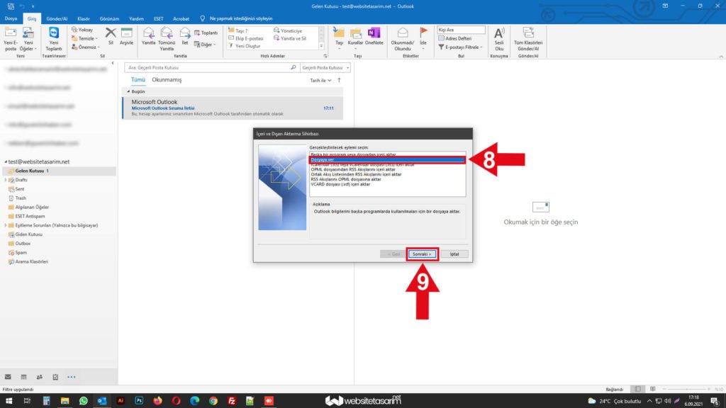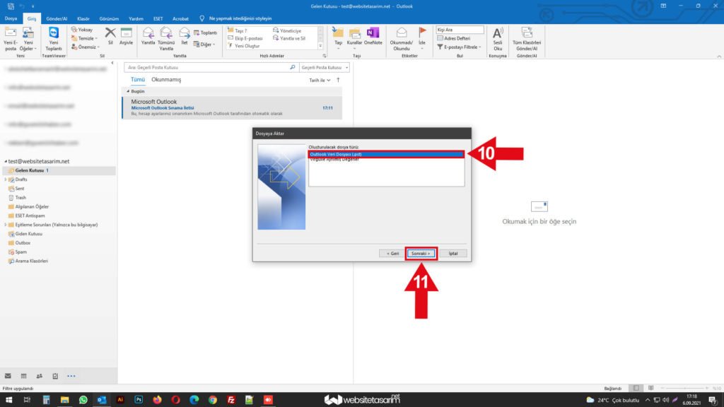 ● Ok içerisinde “10” ile göstermiş olduğumuz alandaki “Outlook Veri Dosyası (.pst)” seçiyoruz.