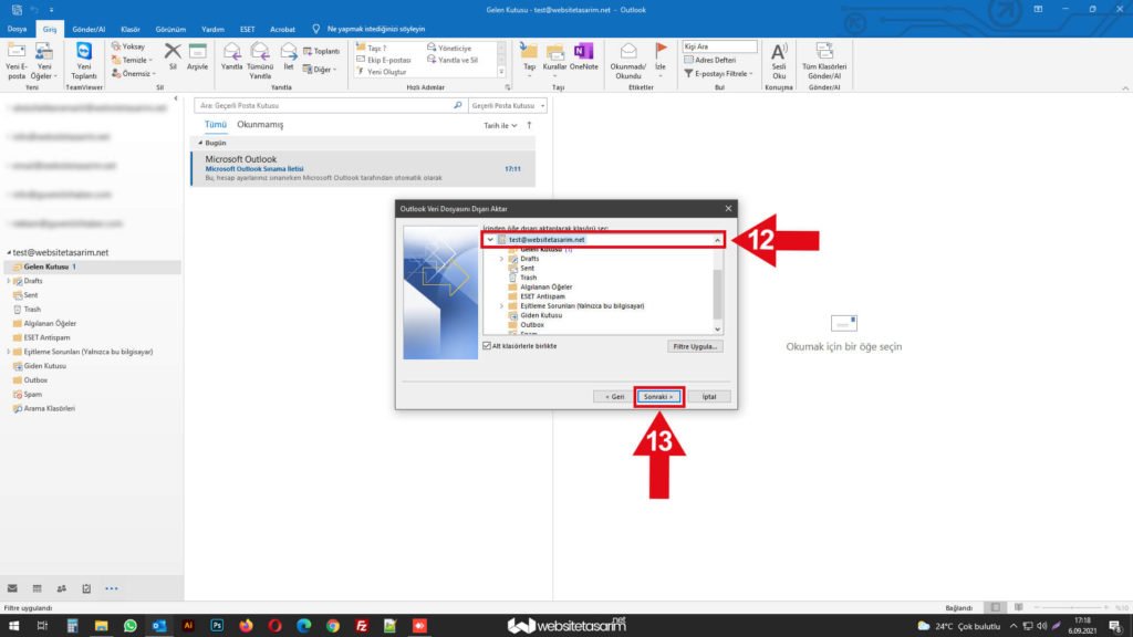 ● Ok içerisinde “12” ile göstermiş olduğumuz alandaki mailimize tıklıyoruz. “Alt klasörlerle birlikte” ibaresi varsayılan olan seçili gelmektedir. Seçili olarak gelmediyse lütfen seçiniz.