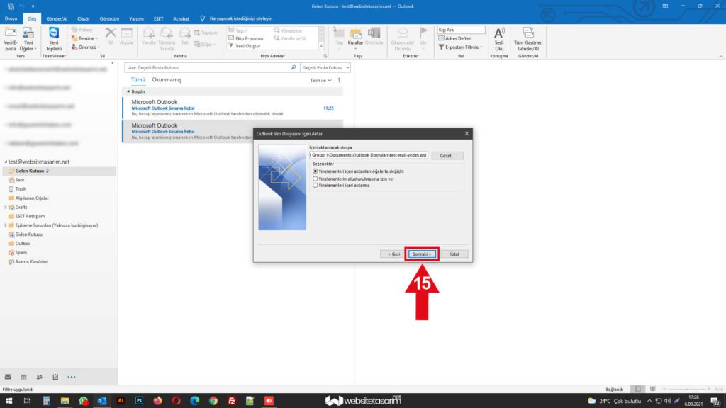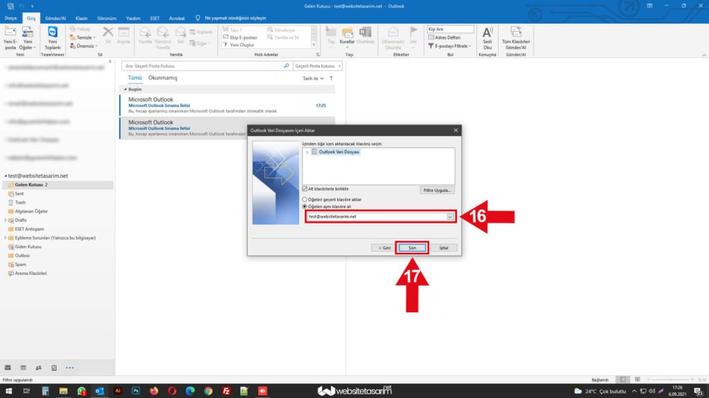 ● Karşımıza gelen bu pencerede “Öğeleri aynı klasöre al:” tıkladıktan sonra ok içerisinde “16” ile göstermiş olduğumuz alandan “Mailimizi” seçiyoruz.