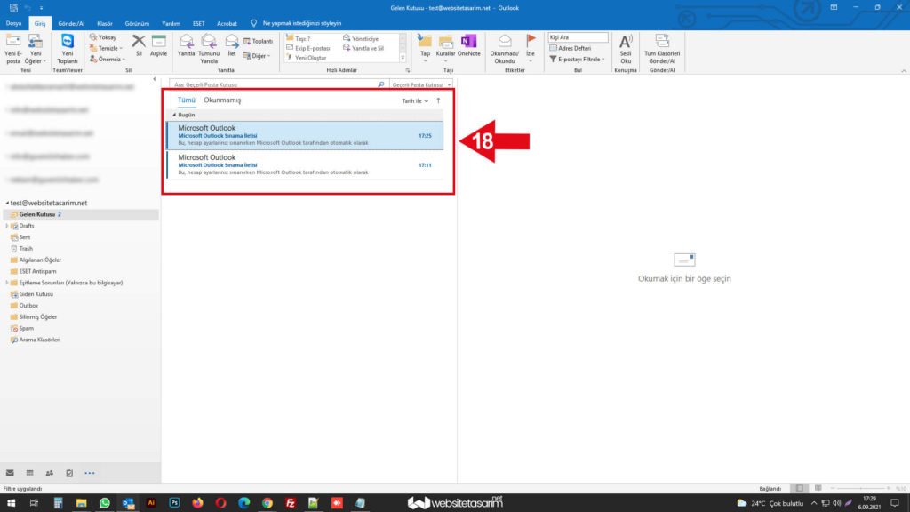 ● Ok içerisinde “18” ile göstermiş olduğumuz alanda maillerimizin içe aktarıldığını görüyoruz ve işlemin başarılı bir şekilde tamamlanmıştır.