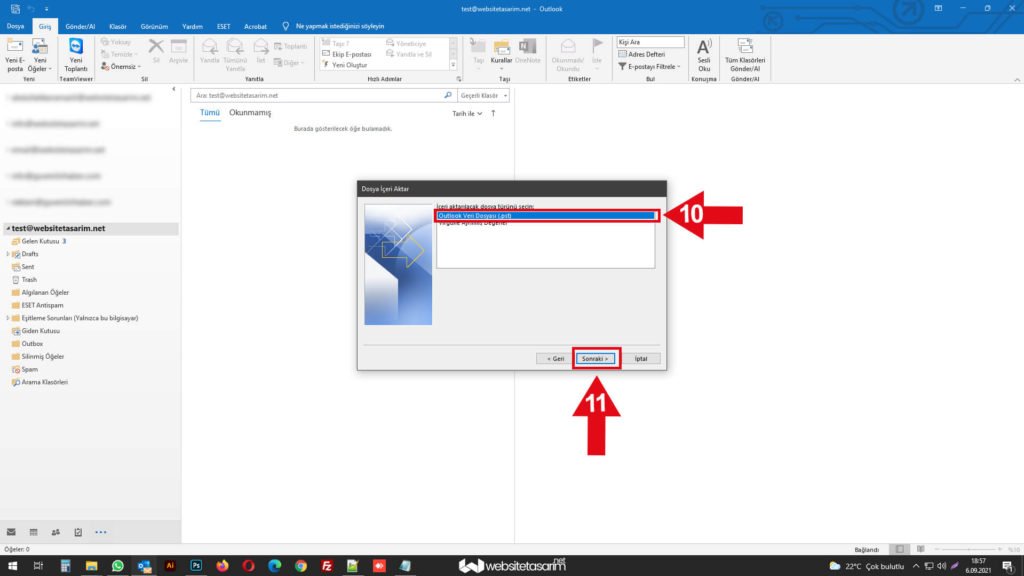 ● Ok içerisinde “10” ile göstermiş olduğumuz alandaki “Outlook Veri Dosyası (.pst)” seçiyoruz.
